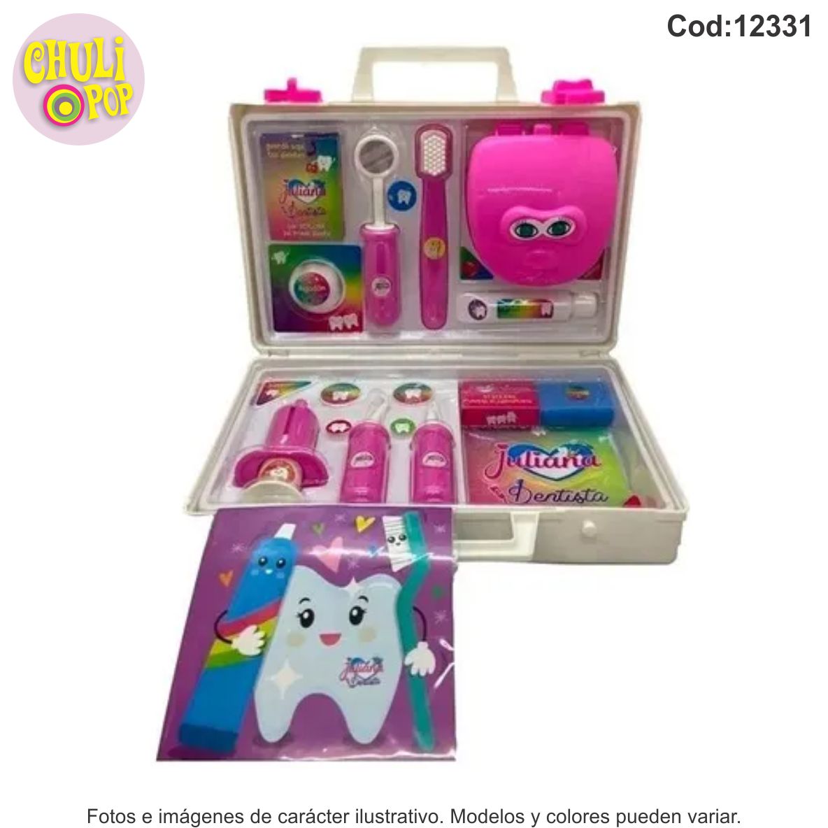 Juega a la dentista con tu valija Juliana! Caja para guardar dientes Pasta Dental (Ficticia) Boca para explorar con stickers de caries Jeringa Explorador Torno Esponja Cepillo de dientes Y demás Accesorios Manual con recomendaciones y Diploma