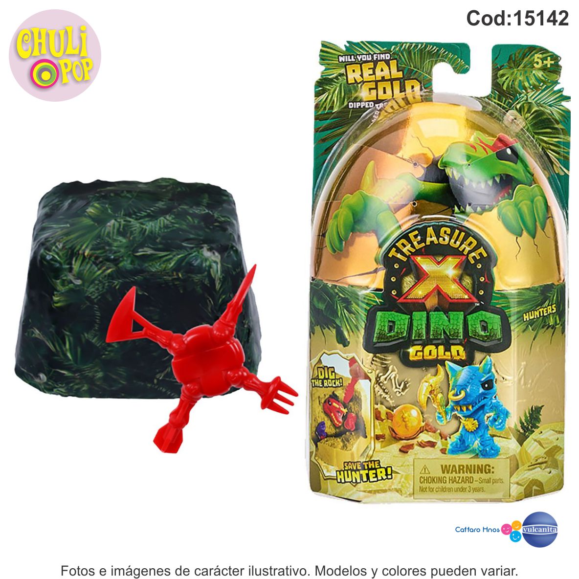 Treasure X | Treasure X Dino Gold Single Pack trae Mini Dino Hunters para desenterrar y más tesoros para encontrar. Prepárate para diez niveles más de aventura. ¡La clásica experiencia de excavación de unboxing del Treasure X tiene un nuevo compuesto de bloques de piedra para excavar y romper! ¡Construí tu herramienta de excavación especial que ahora viene con un cepillo y excavá y rescatá nuevos Mini Dinos y una colección completamente diferente de Tesoros! Esta vez, los tesoros están encerrados dentro de un fósil. Usá todas las partes de tu herramienta para romper el fósil y descubrir tu tesoro. Usá tu herramienta para romper el fósil y descubrir tu tesoro dentro de un recipiente de color ámbar. ¡Usá la llave dorada X para abrir! ¡Busca siete tesoros diferentes!. ¿Tendrás la suerte de descubrir el tesoro de oro? Hay 12 nuevos Mini Dino Hunters para encontrar y coleccionar, muchos con nuevos y diferentes acabados. ¡Estate atento a los cazadores de dinosaurios con acabados de cristal, piedra, alquitrán y oro! Cada figura de acción de Mini Dino tiene un toque de brillo. Hay una posibilidad entre 18 de encontrar un tesoro bañado en oro real. Contiene: 1 Personaje + Arma, 1 bloque para excavar, 1 mapa/guia del coleccionista/1 esfera/1 herramienta y un tesoro.